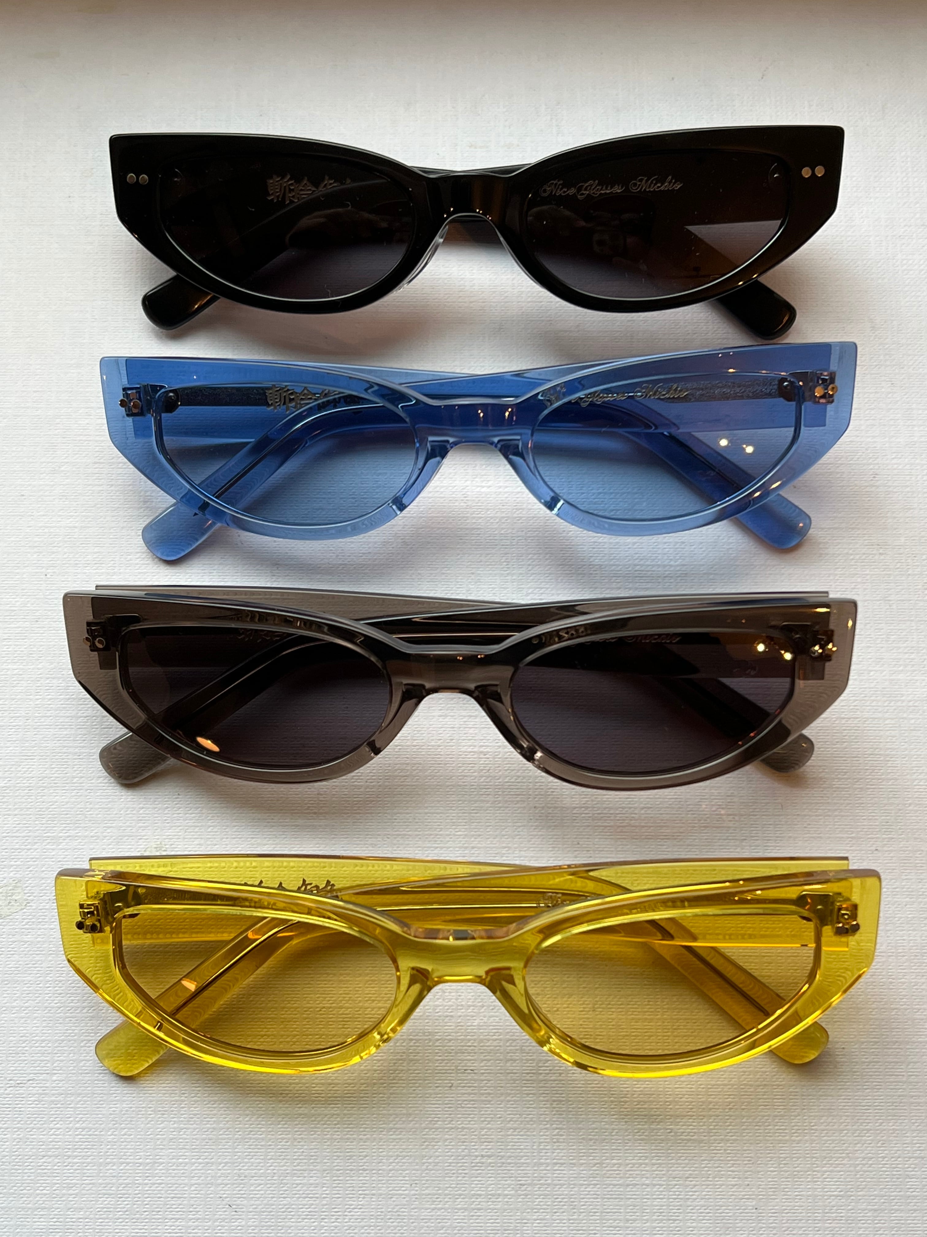 Cat’s Eyeと呼ばれる形状をベースに細身でフラットなラップアラウンドタイプにリシェイプ。サイズは幅148×高さ35mmでJET BLACK / ICE BLUE / KALICHROME YELLOWの3色展開。素敵眼鏡MICHIOだけで手に入る限定色としてClear Dark Brownをラインナップする。